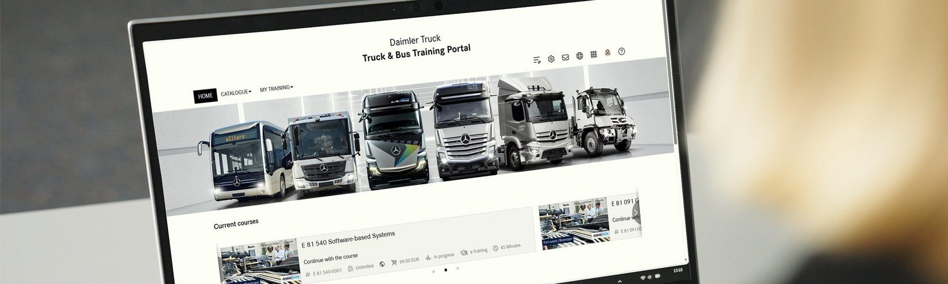 OMNIplus gør det særlig nemt for dig med den ydelsesstærke bustræningsplatform: På https://training.buses.daimlertruck.com/ kan du se indholdet af OMNIpluss digitale læringsverden og booke det fleksibelt. Takket være overskuelige filterkriterier såsom kompetenceområde, læringsform og sprog finder du hurtigt frem til det passende digitale læringstilbud. Desuden kan du til enhver tid se dine kommende kurser og dine medarbejderes læringshistorik transparent. Dette hjælper dig med at kvalificere dine chauffører og værkstedsmedarbejdere så målrettet som muligt.