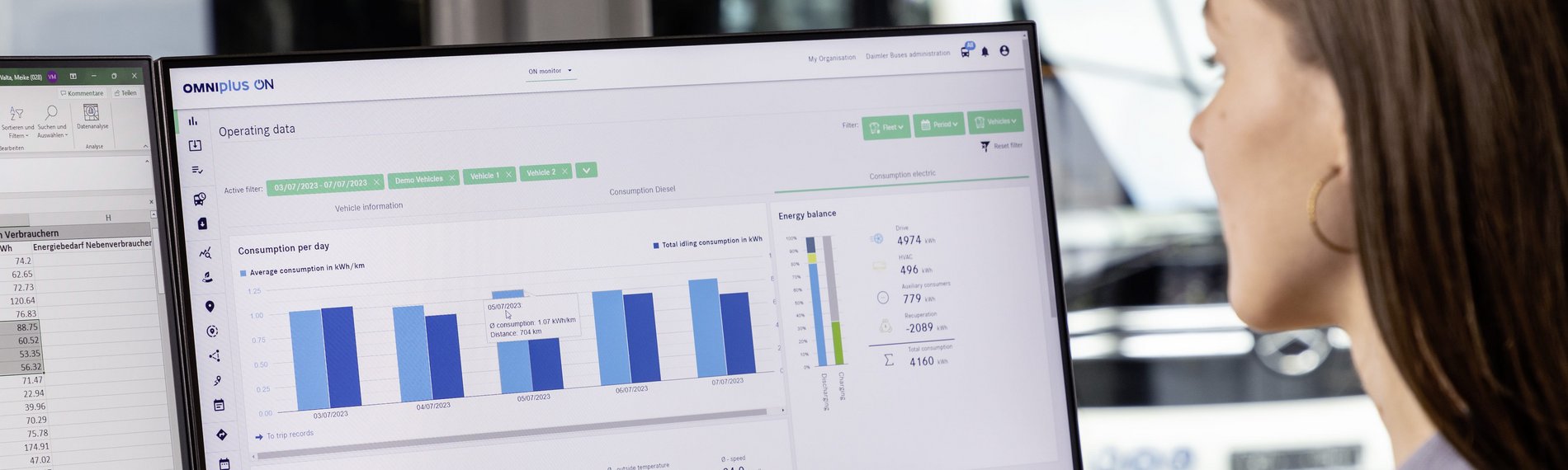 Cât consumă fiecare vehicul? Care sunt autonomiile rămase? Cât este consumul staționar? Și câtă energie a fost recuperată de eCitaro sau eCitaro fuel cell? Funcția „Analiza consumului” a OMNIplus ON monitor vă permite să analizați tendințele și potențialul de optimizare a consumului – datorită informațiilor detaliate despre consum pentru fiecare vehicul. Acesta este un instrument indispensabil de monitorizare a funcționării, în special pentru flota dumneavoastră de autobuze electrice!